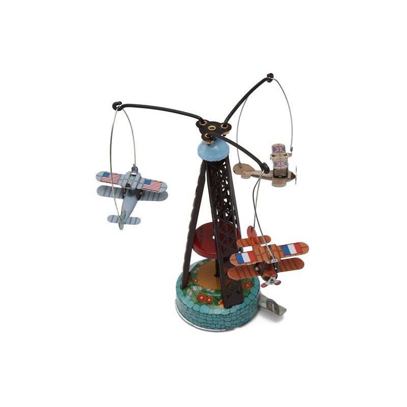 Detailed and well-finished carousel with old fashioned bi-planes which spin when the pull-and-release mechanism is operated. Sturdy and well-built. China, 13cm