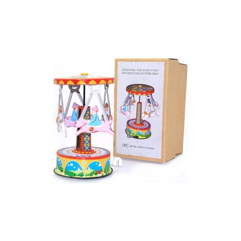 Eccentric, brightly coloured carousel. This unconventional carousel has pigs and dogs, instead of the traditional horses. The figures on the ride are colour coordinated to their chosen animals, via hats and bonnets. The top of the carousel is decorated with scenes from 6 fairy tales (Frog Prince, Sleeping Beauty, Snow White, etc.) 11cm.