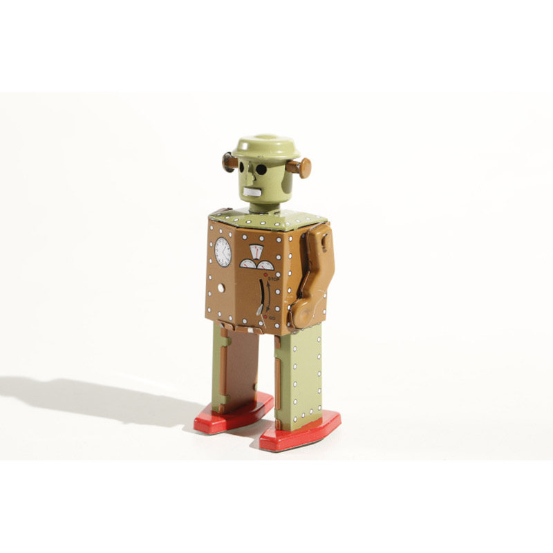 This was one of the earliest toy robots, manufactured in occupied Japan in the late 1940s. Atomic Robot Man is a sturdy tin robot with a smooth walking action when wound and the start lever released. All metal construction, 14 cm tall, China.